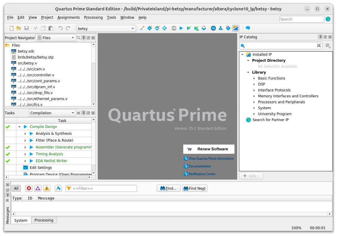 $ git clone https://privateisland.tech/repos/cgit.cgi/privateisland Cloning into 'privateisland'... Fetching objects: 431, done. # locate the Quartus Project File $ cd privateisland $ ls -l manufacturer/altera/cyclone10_lp/betsy.qpf manufacturer/altera/cyclone10_lp/betsy.qpf