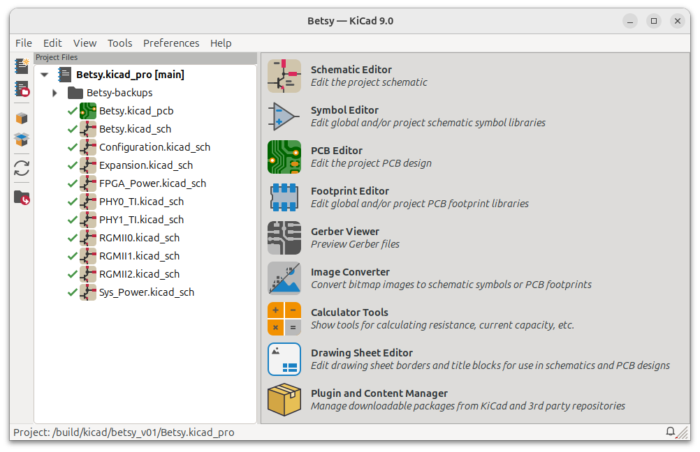 It is assumed that you have cloned the betsy_v01 repo and opened the project in KiCad 9.0. After opening the project, your view of the (imported) project should be similar to what is shown in the screenshot below.