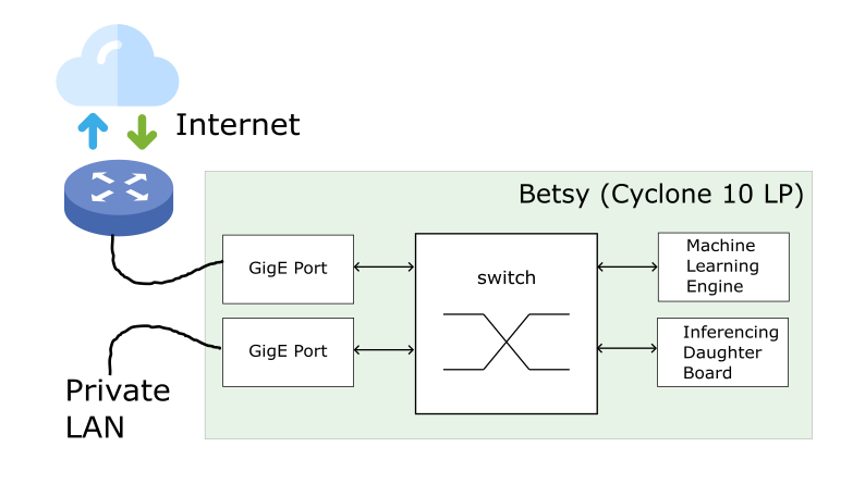 Figure 1 below depicts the machine learning architecture with Betsy, a GigE daughter board, and an external PC performing real-time inferencing for network and other applications. Although the Betsy Cyclone 10 LP is well suited for general network processing, data collection, and vector / tensor generation, it most likely lacks a suitable DSP architecture for real-time inferencing except for simple cases.