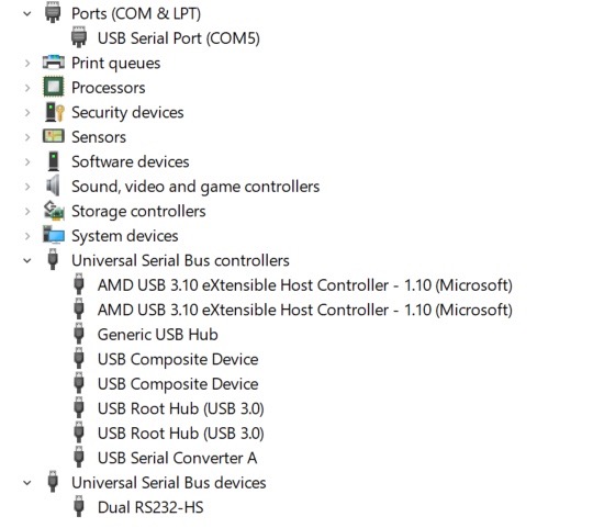 The figure below is our Device Manager after running Zadig. You can see that COM6 and USB Serial Converter B disappeared. In its place is "Dual RS232-HS", which represents a WinUSB driver.