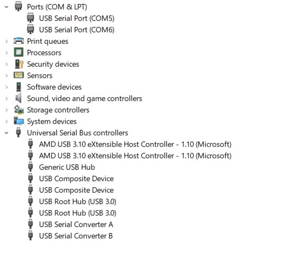 The figure below shows our Device Manager before running Zadig. COM5, COM6, and USB Serial Converter A and B represent the drivers for the two FTDI ports.