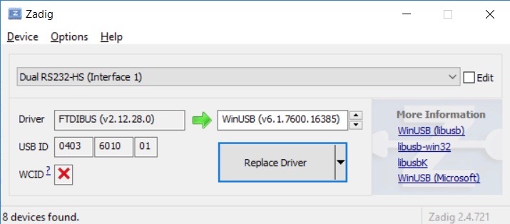 The next figure is the Zadig application. In order to see our FTDI device, we chose "Options->List All Devices". We selected Interface 1 for Port B. After selecting the device, we clicked "Replace Driver".