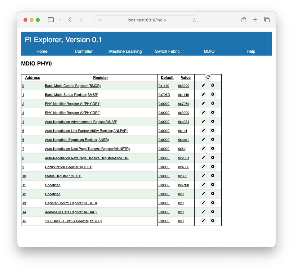 This view currently performs a quick scan of the Ethernet PHY's internal registers via its MDIO interface. Refer to the PHY's datasheet for the definition of each register.